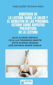 Los libros nos cuidan: por una biblioterapia creativa, Régine Detambel, NED, 2019.Beneficios de la lectura sobre la salud y el bienestar de las personas. Estudio sobre aspectos preventivos de la lectura. Alonso-Arévalo, J., Fernández MartíAlonso-Arévalo, Julio ; Fernández.Martín, Celia Luz ; Alonso-Vázquez, Antia ; Mirón-Canelo, José-Antonio. Lisboa: Associação Portuguesa de Documentação e Informação de Saúde (APDIS ), 2020. Publicações Técnicas APDIS.